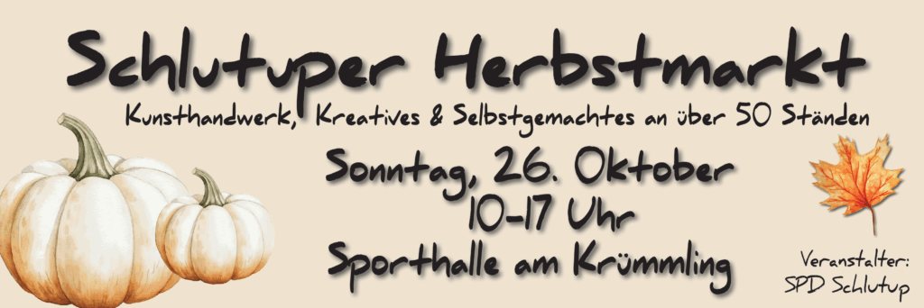Der Schlutuper Herbstmarkt ist ein lokaler Kunsthandwerkermarkt, der sich in seiner jetzigen Form bereits seit 1993 präsentiert. Auf über 1000m² präsentieren 57 Aussteller in der Willy-Brandt-Sporthalle in Lübeck/Schlutup allerhand Selbstgemachtes.